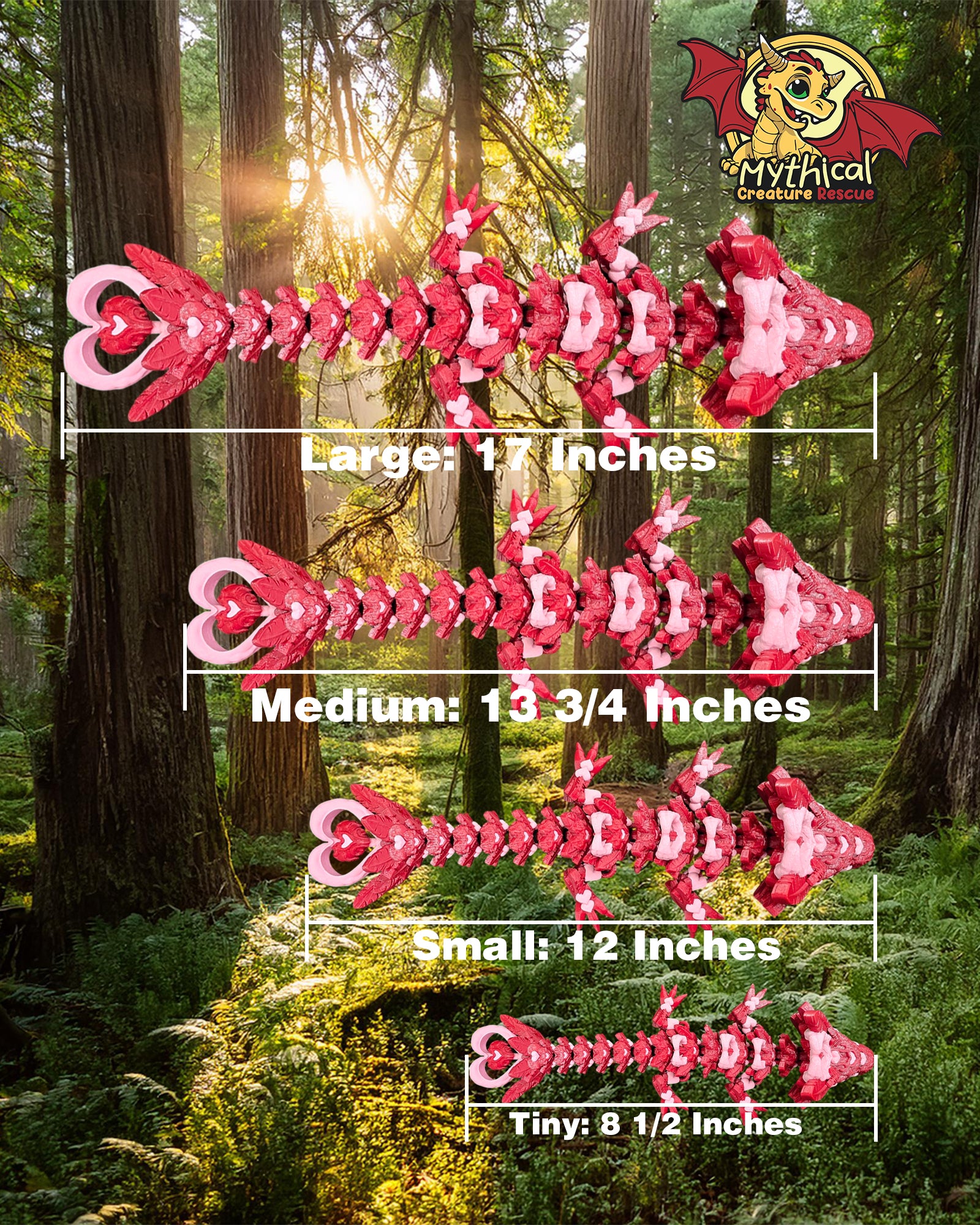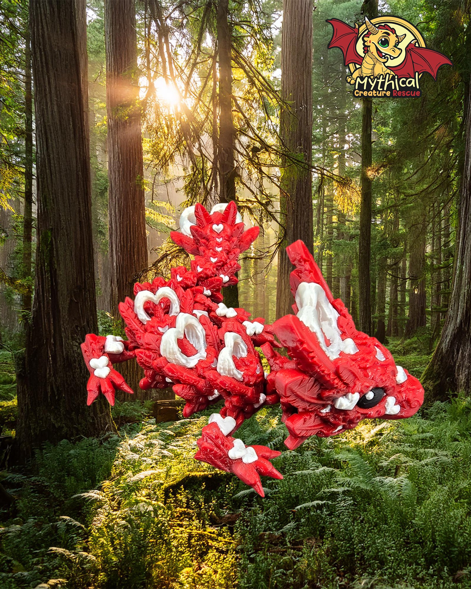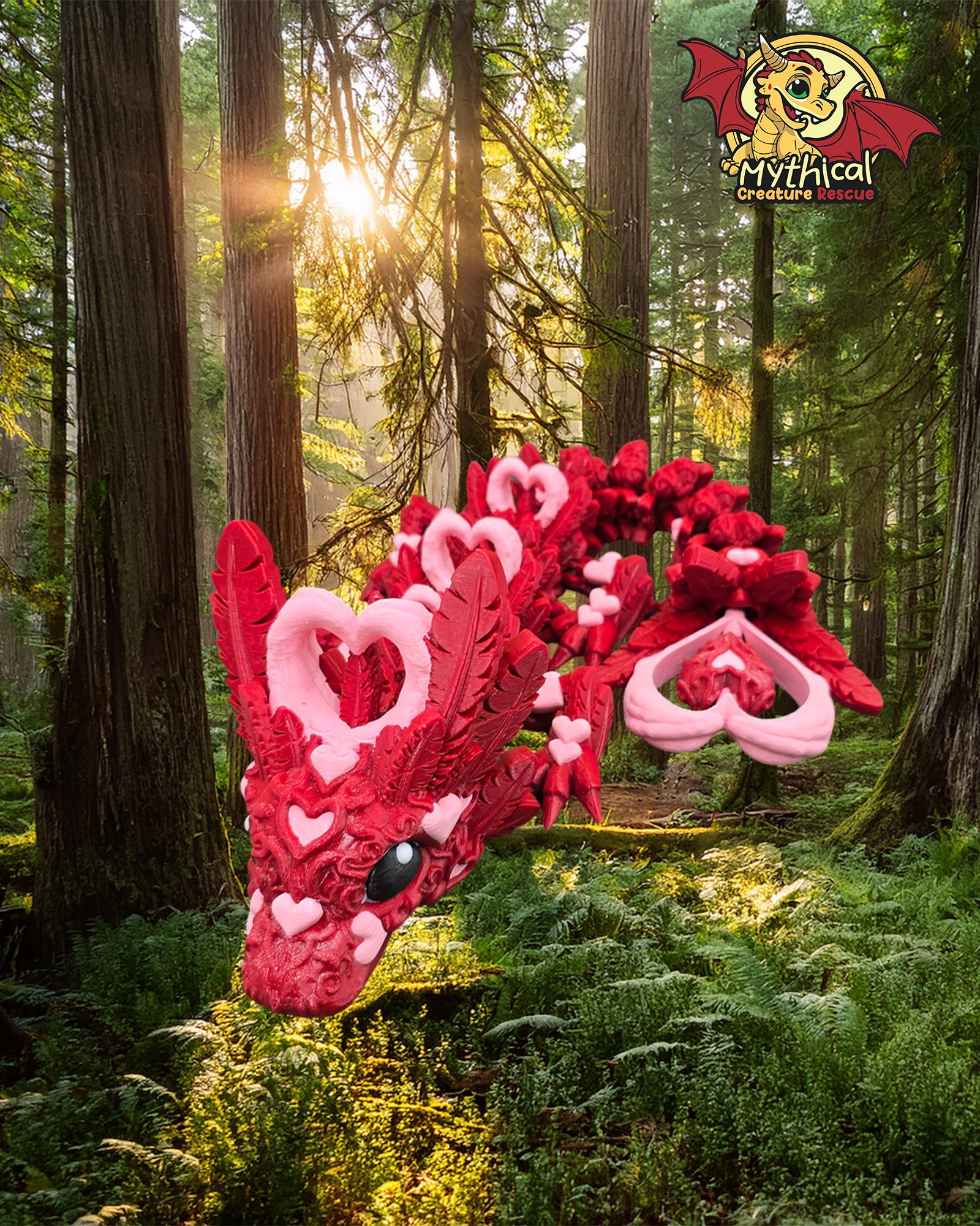In a secluded part of the forest, two heart dragons, known for their deep bond with humans, found themselves in grave peril. These dragons had always lived in harmony with the forest and its inhabitants. However, a recent series of natural disasters had devastated their habitat, leaving them vulnerable and unable to fend for themselves. Introducing our articulated Wylie Dragon, a high-quality 3D printed model that symbolizes resilience and the enduring connection between creatures and humans. As part of Mythical Creature Rescue's mission, each purchase helps support our cause to helping the lost, abandoned, and helpless mythical creatures find their Magical Second Chance.